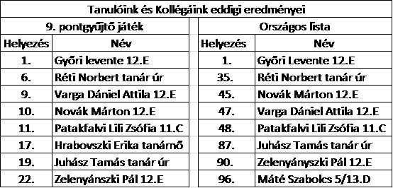 Nemcsak a mostani pontgyűjtő játék terén tudunk eredményeket felmutatni, hanem örömmel jelentjük, hogy az országos pontgyűjtő listán Győri Levente, 12. E osztályos tanulónk elérte az első helyet, így most ő a csúcstartó a georeferálók csapatában.