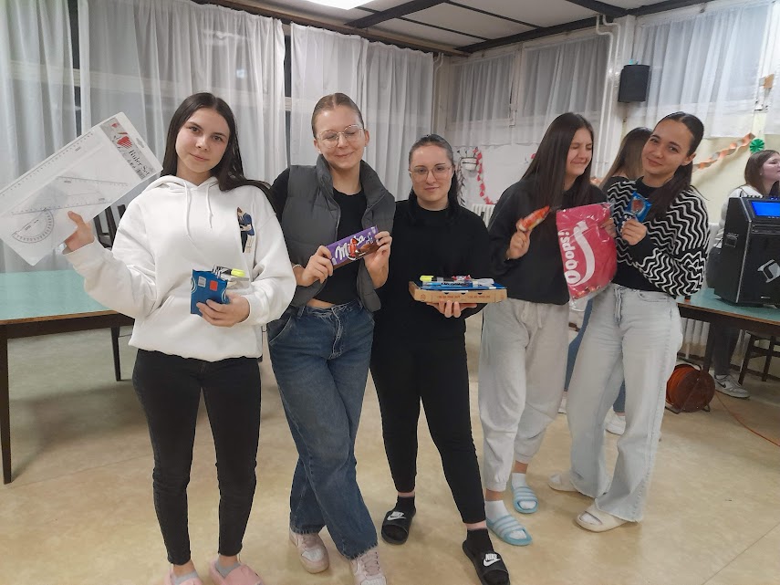 Mind egyéni, mind csapatversenyben tombolát kaptak a legügyesebb játékosok, növelve ezzel nyerési esélyüket az esti tombolahúzáson. Eközben a L/2. csoport lányai egy-egy tálca ízletes csőröge fánkkal lepték meg a csoportokat, melynek csábító illata belengte a folyosókat. A vacsora után a L/3. lánycsoport tagjait fedezhettük fel a jelmezek mögött, akik kézilabda csapatnak öltözve vonultak be, de sajnos kihívójuk nem akadt. Így egy óriás pizzával vigasztalódtak jutalomképpen.